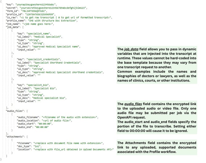 - If more than one audio or document is being submitted through a single job, use the Upload Audio and/or Upload Document call to upload one audio/video or document at time, to receive a separate link for each upload. Provide a separate link for each file as per the sample code in the audio and document arrays respectively.