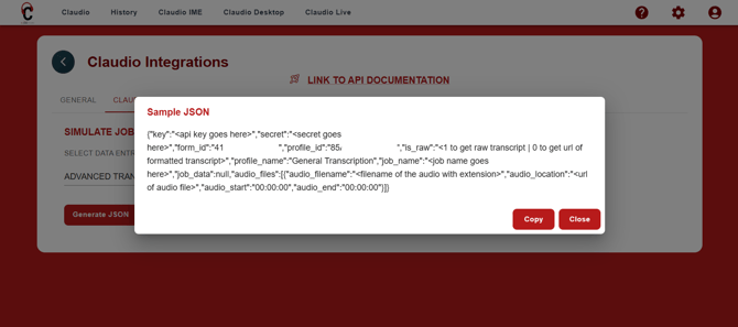 - You will need to copy the Sample JSON from there to paste into your Submit Job API call.