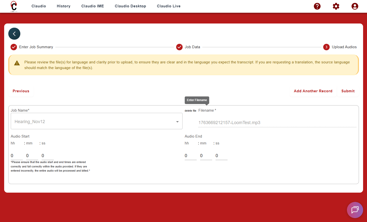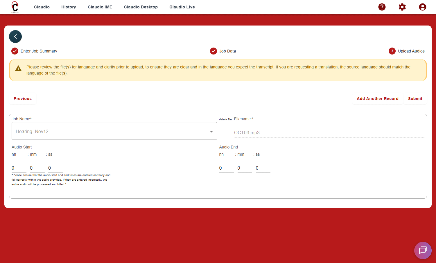 You can also include additional media files in the same job by clicking the Add Another Record button.