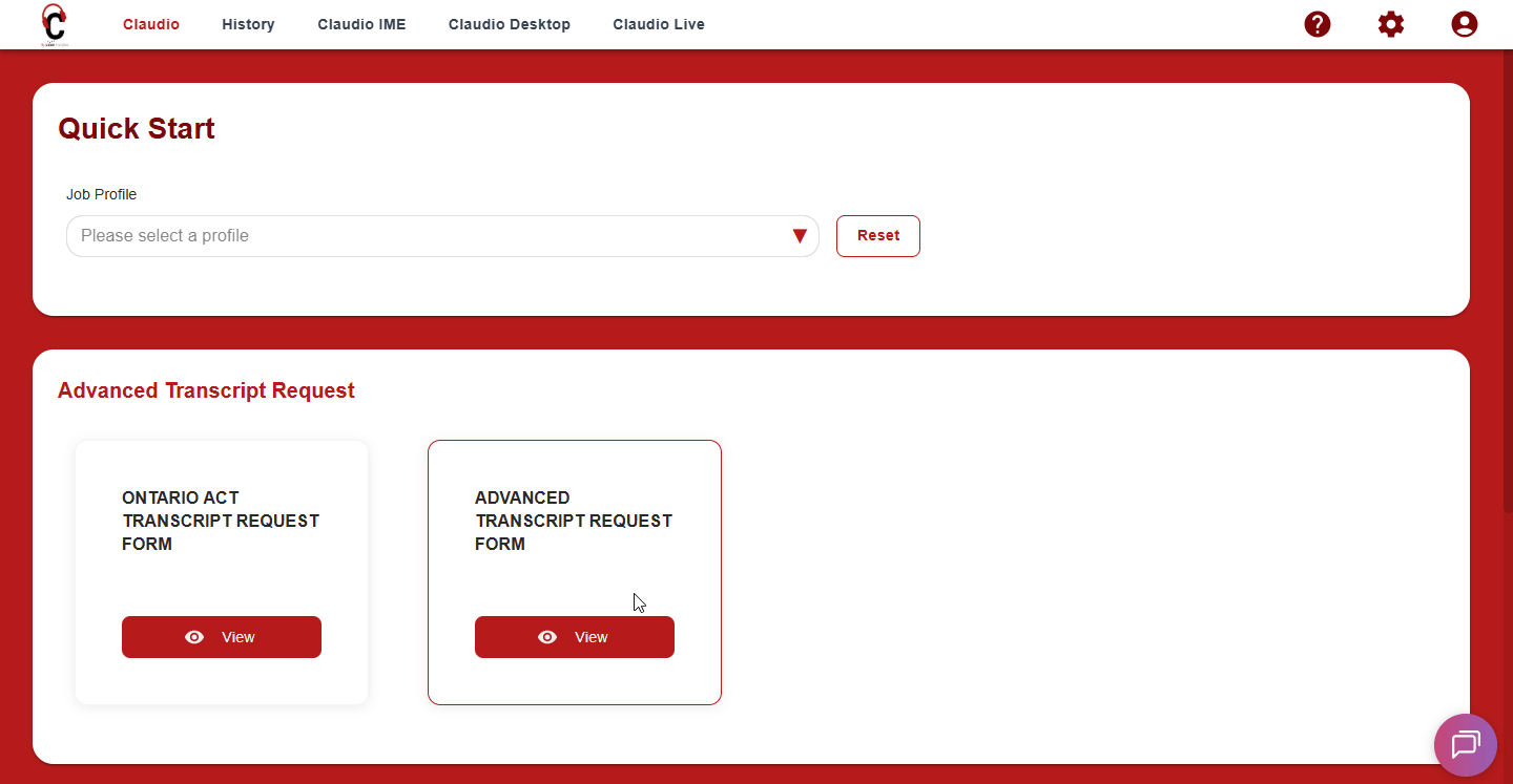 From the Advanced Transcript Request Form field, select the transcription service you need, then click View.