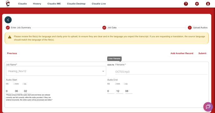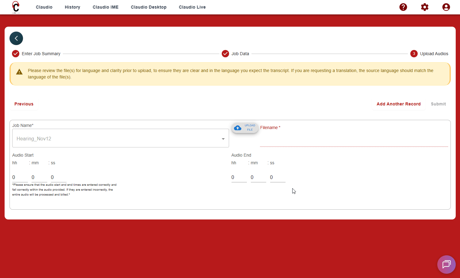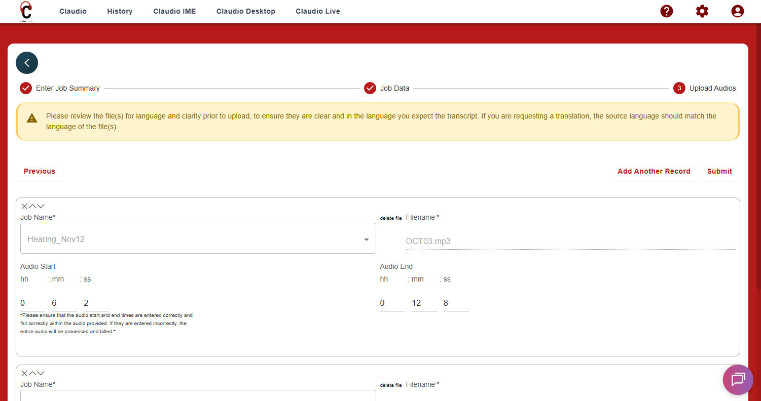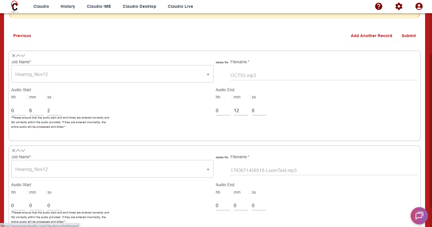 CAUTION: Refer to the source media timestamps when using this feature. For example if you have a 10 minute recording and you want only the last 2 minutes transcribed, you would enter: Audio Start: 00:08:00 and Audio End: 00:10:00. The transcription will start from the 8th minute until the 10th.